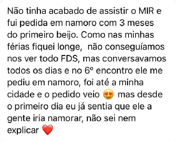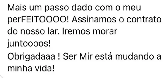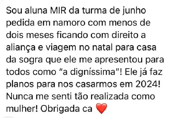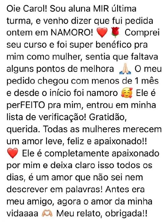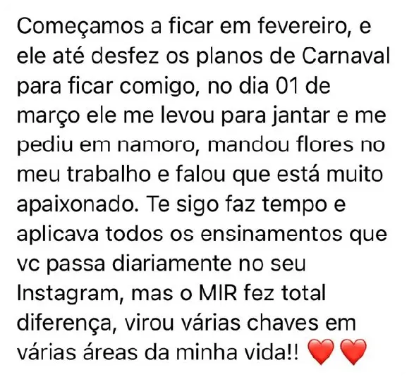 Não se trata simplesmente de um treinamento. O MIR é o conjunto de técnicas, estratégias e metodologias testadas e VALIDADAS usadas para conquistar o namoro dos sonhos e, posteriormente, o seu casamento e a sua família. O relacionamento feliz e apaixonado que VOCÊ merece e é plenamente capaz de alcançar. É uma completa e profunda TRANSFORMAÇÃO NA SUA VIDA.